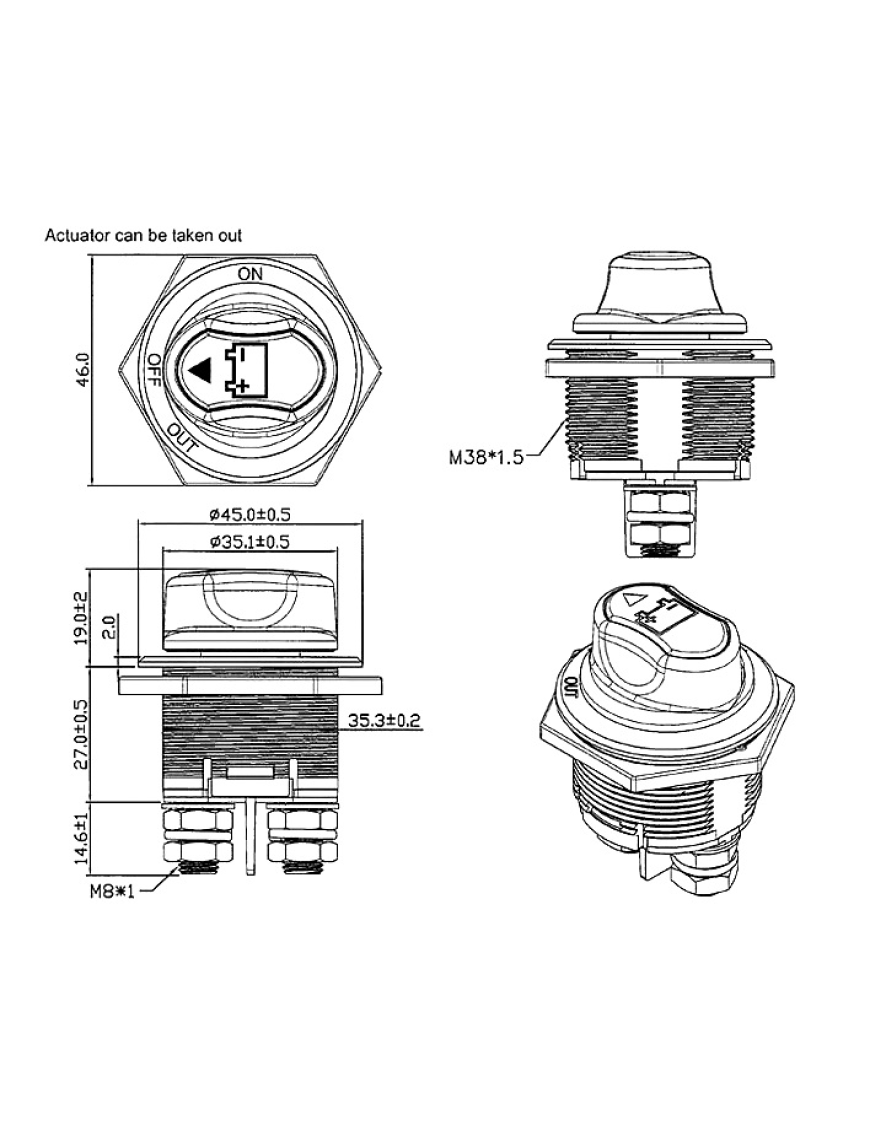 На ручці 3 положення перемикача: OFF-ON-OUT. Положення OUT використовується як протиугінний засіб, в цьому положені ручка знімається, залишаючи вимикач без можливості обороту.
