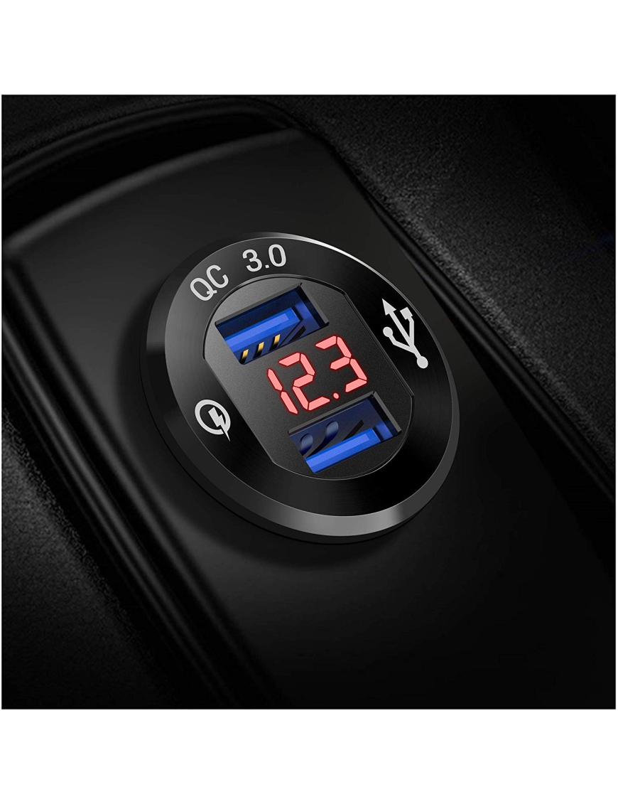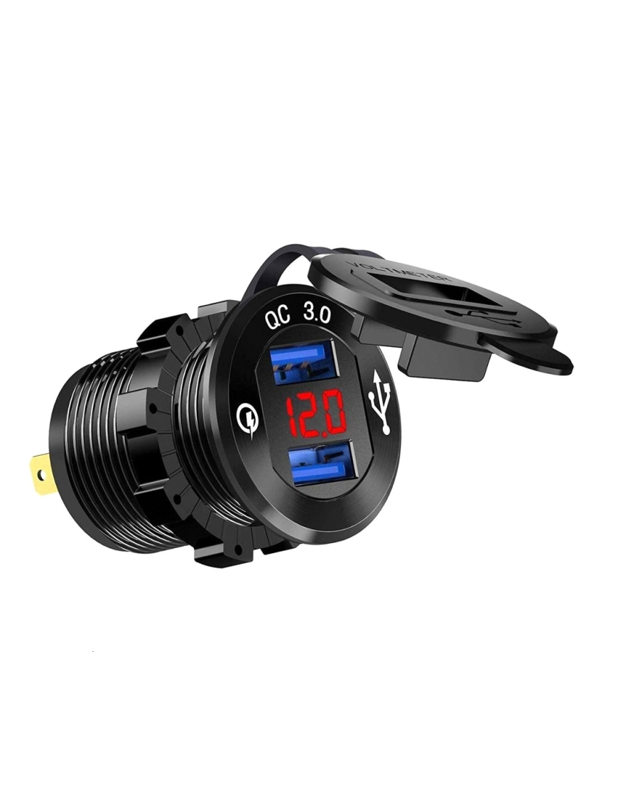 Адаптер USB зарядки з двома виходами Quick Charge і вольтметром. Індикація роботи вольтметра червоним.