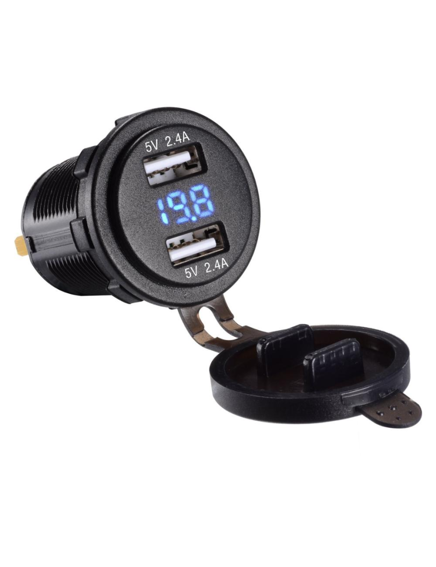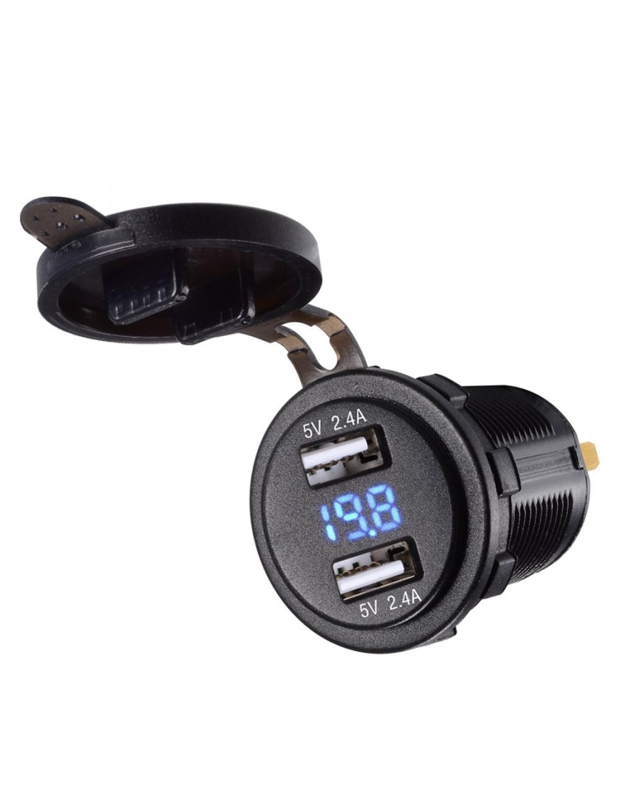 Адаптер USB зарядки на два роз'єми по 2.4 і 2.4А. Індикація роботи вольтметра синім.
