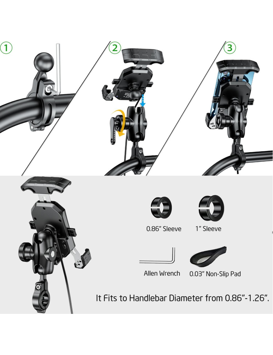 Встановлюється на кермо, в кріплення дзеркал чи в елемент де є болтове сполучення.