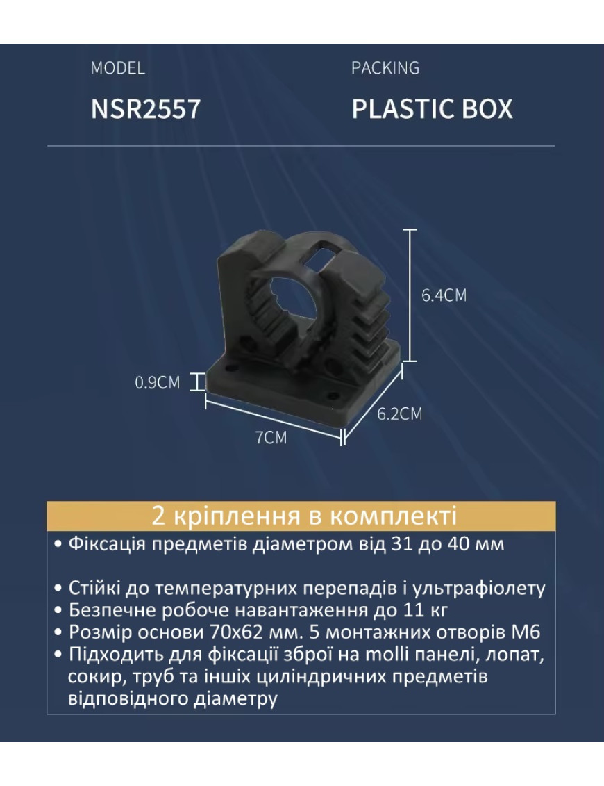 Модель NSR2557 використовуються для фіксації предметів діаметром 31-40 мм, таких як сокири, лопати, інструменти, ліхтарі, ножи, для балонних ключів, молотків, на Molle панелі, та інших округлих предметів.