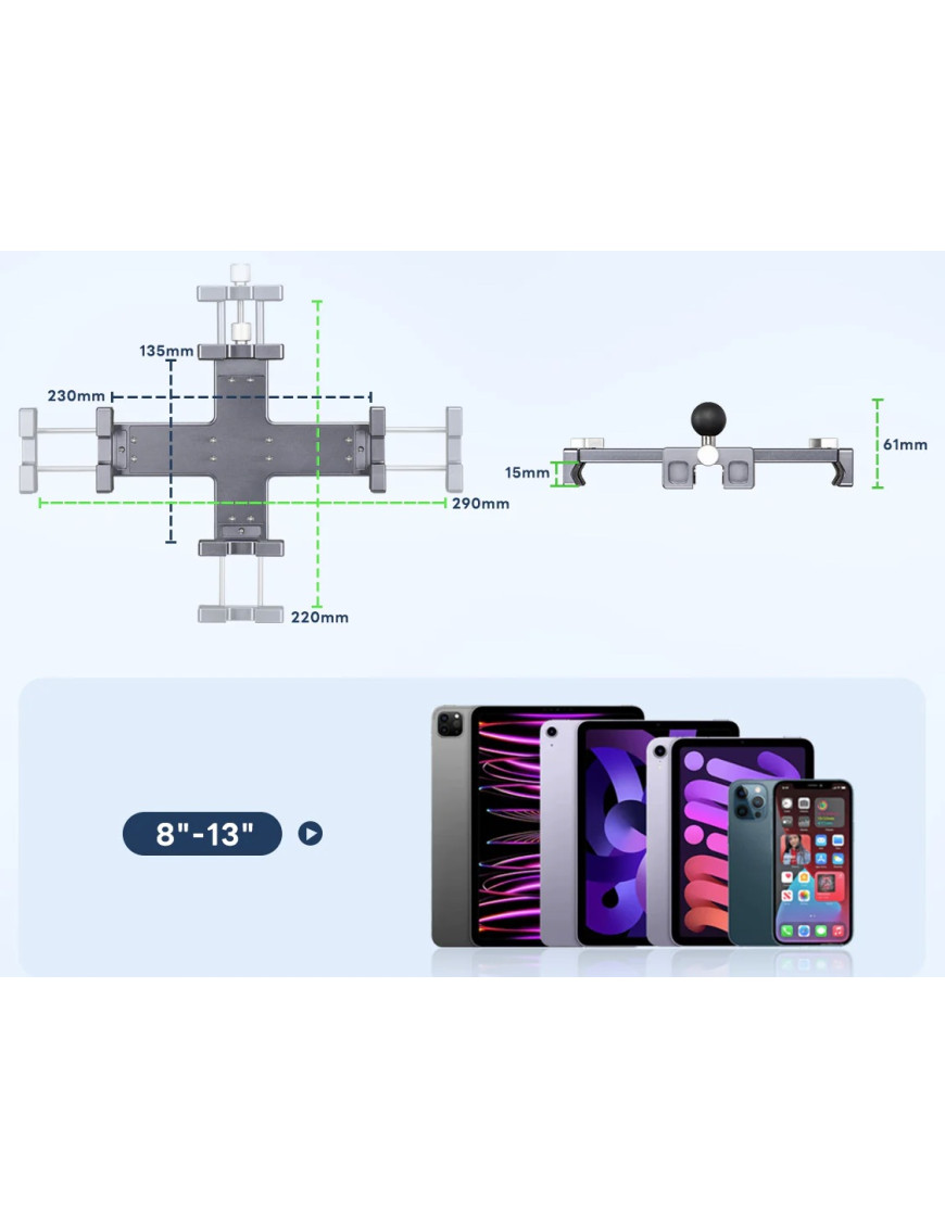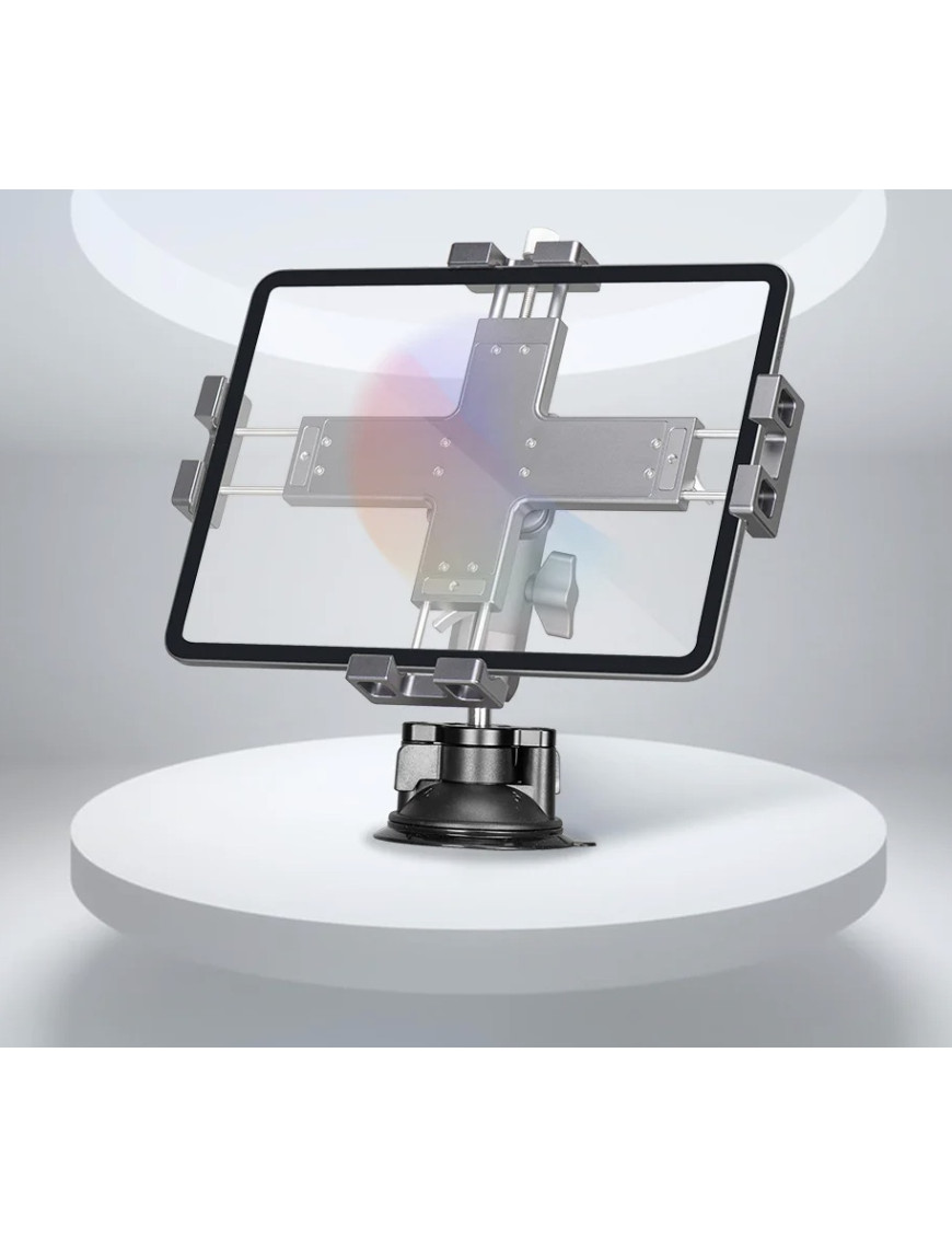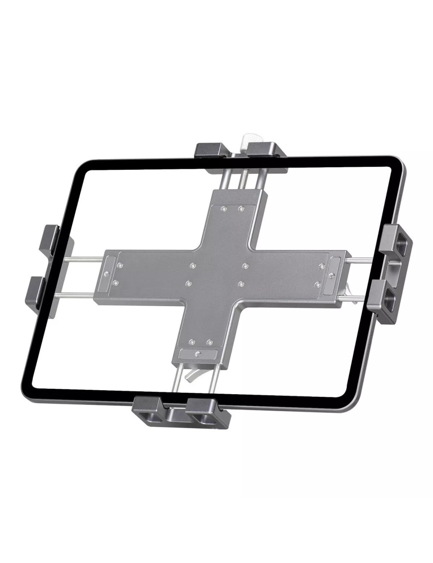 Дуже міцний металевий тримач для планшетів, міцна фіксація за рахунок різьбових з’єднань. Планшет може встановлюватись як вертикальному так і в горизонтальному положенні, в місцях дотику передбачені гумові накладки-демпфери.
