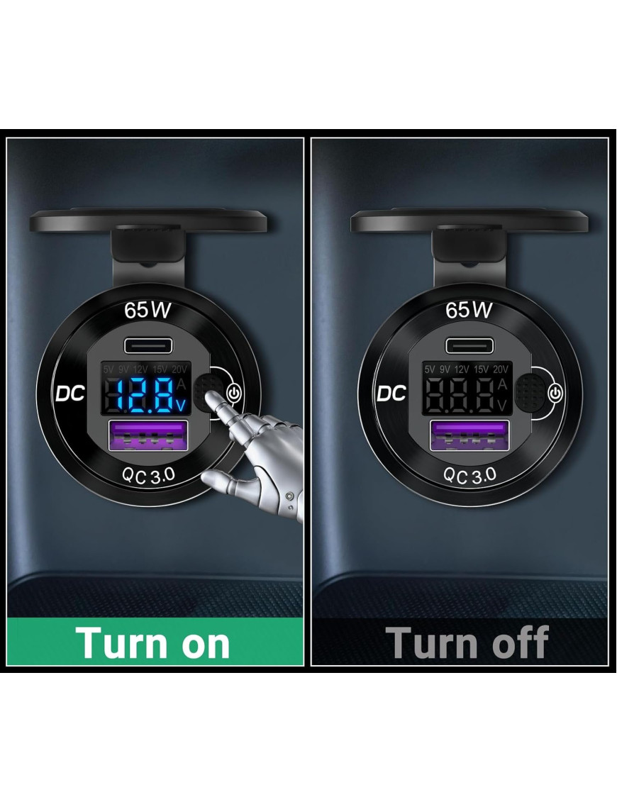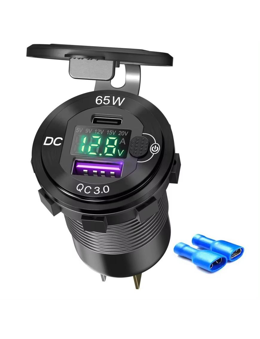 Швидкісна Quick Charge 3.0 на 18W + максимально потужний вихід PD Type-C 65W для заряджання лептопів. Кнопка знеструмлення модуля. Індикація вольтметру зеленим. Відмінна якість, цифри на виході відповідають заявленим. Клеми підключення в комплекті.