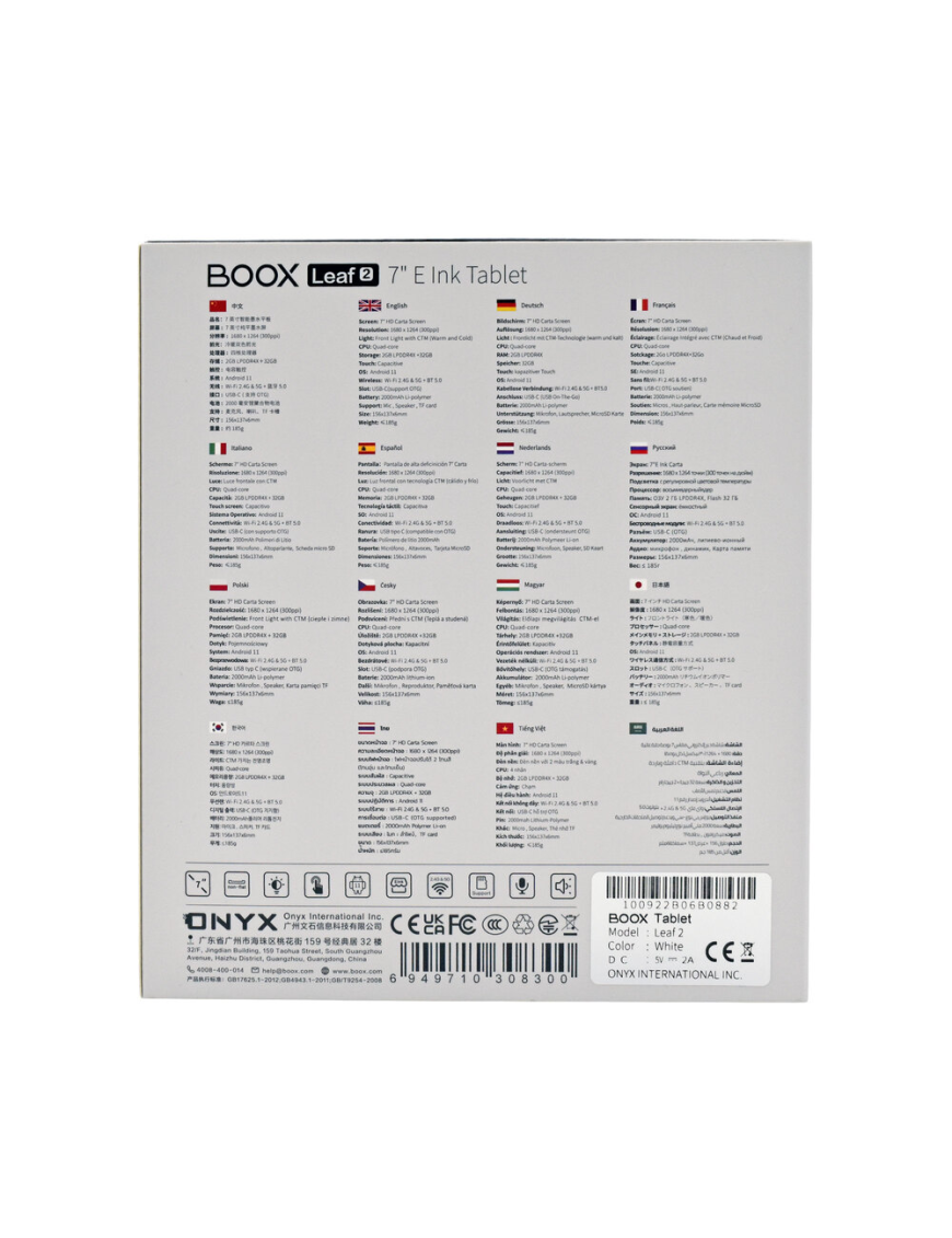 Onyx Boox Leaf 2 White – електронна книга з екраном 7 дюймів. Компактний рідер, розмір якого є ідеальним для читання художньої літератури та умовно PDF файлів, але з деяким напруженням очей. Операційна система базується на 11 Android, з вільним доступом до Google Play, змогою встановлення та використання сторонніх програм, суттєво розширюючи свою функціональність.