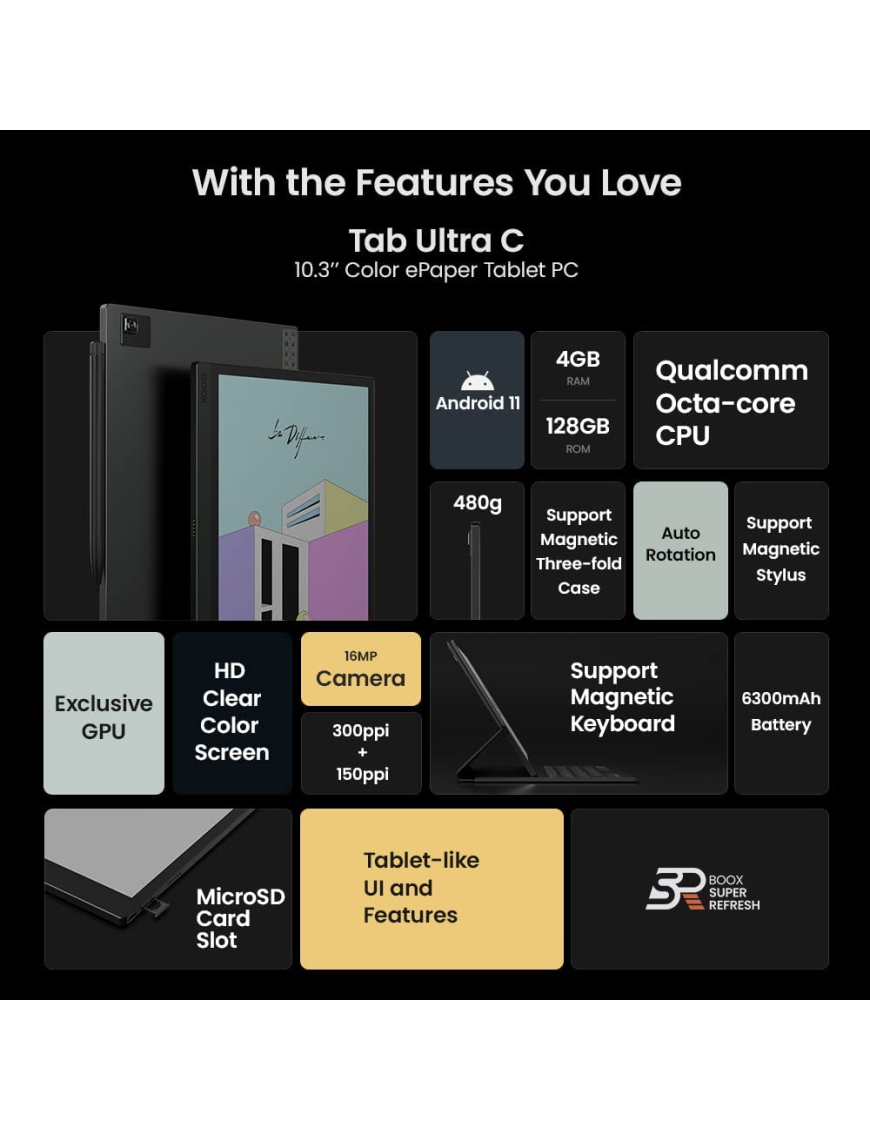 Onyx Boox Tab Ultra С - гібридна електронна книга з кольоровим екраном Kaleido 3 в 10.3 дюймів і максимальною, на даний час, щільністю пікселів для єкранів з такою пропорцією. Вперше Onyx використав на десятидюймових екранах 300 ppi.