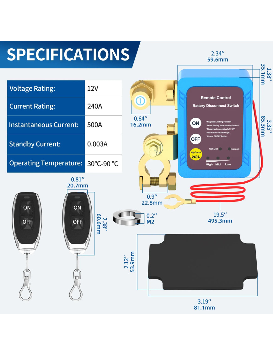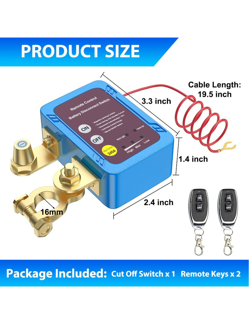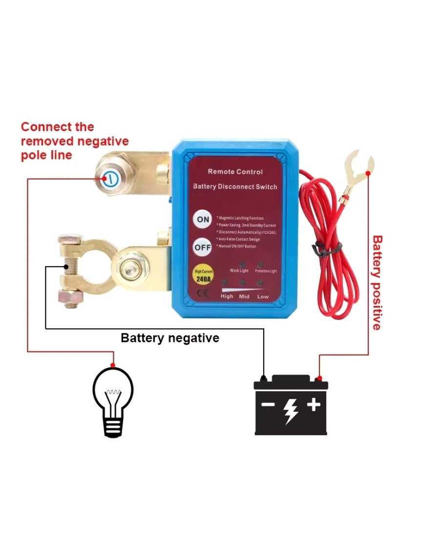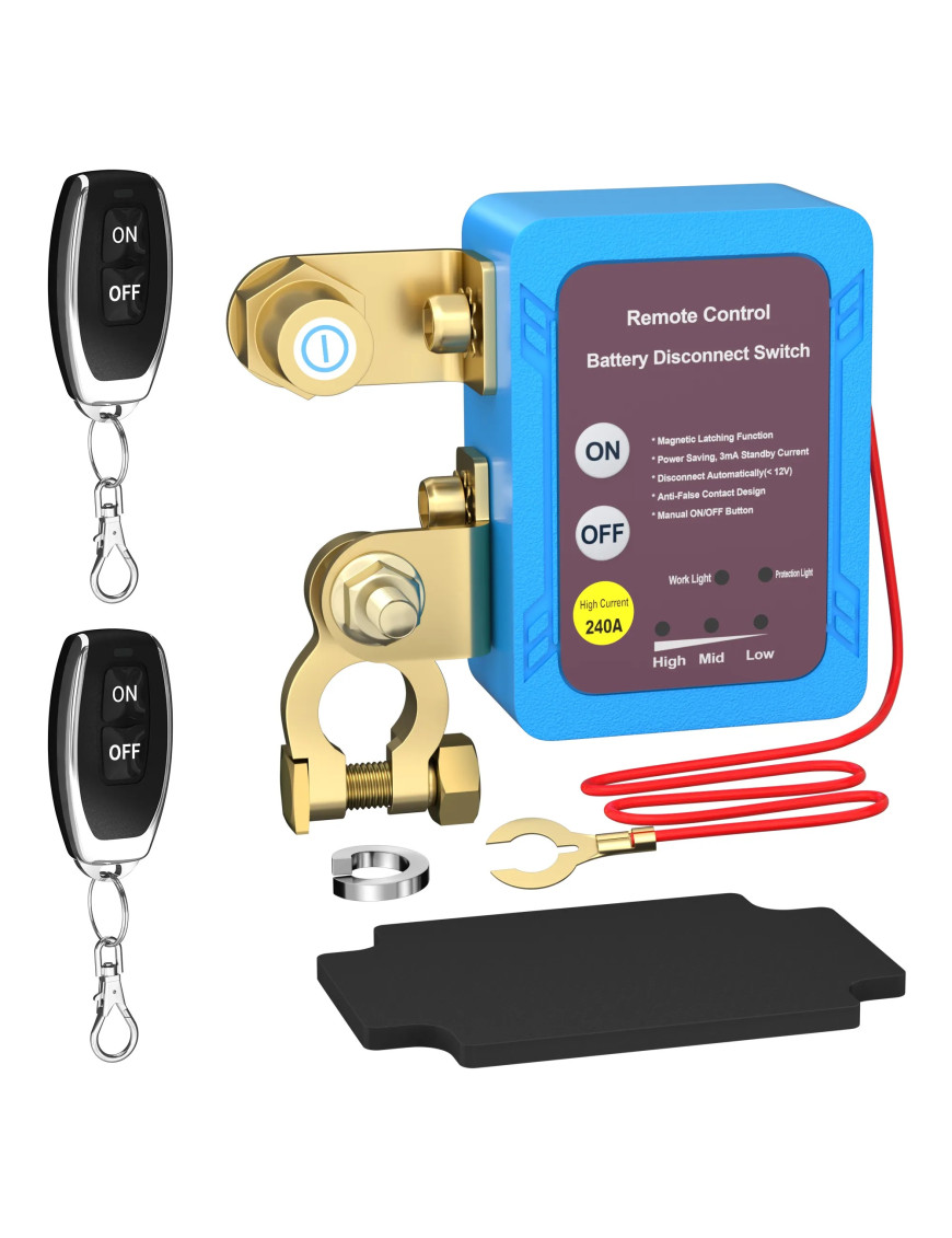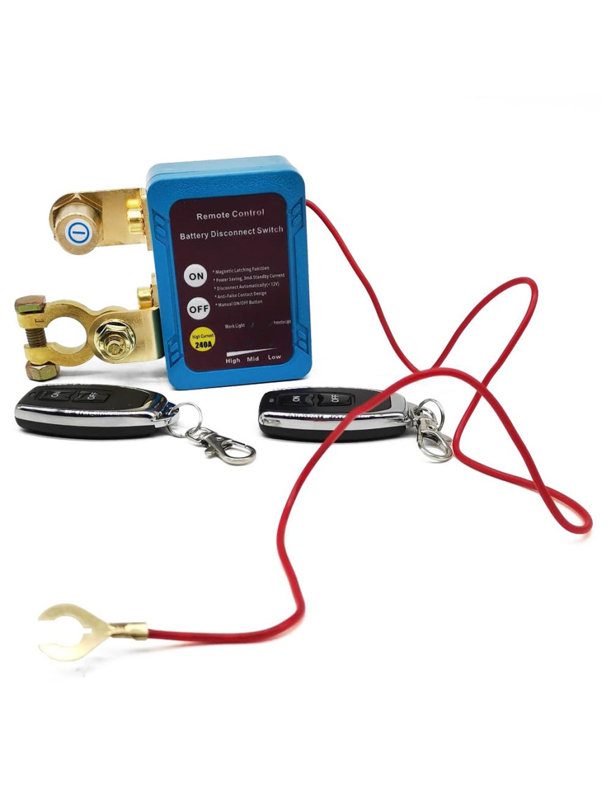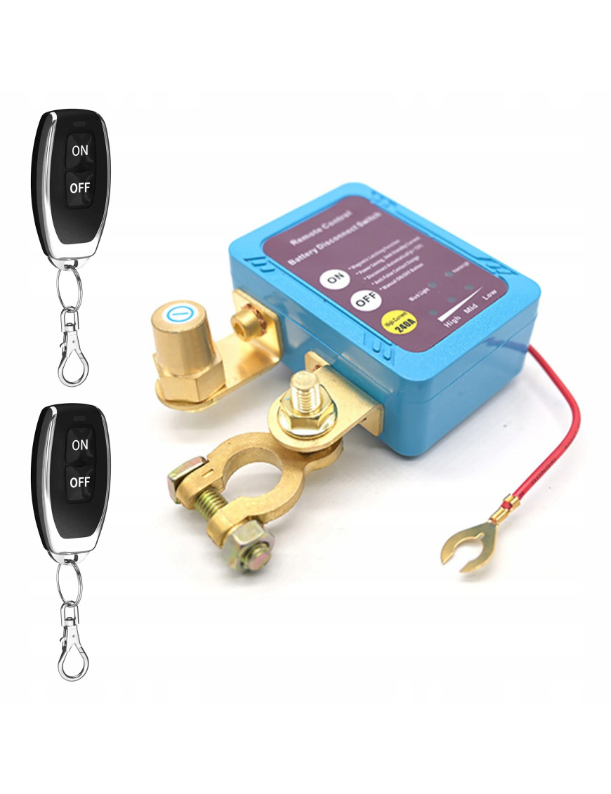 Вимикач маси акумулятора з пультами дистанційного керування призначений для відключення маси в автомобілі, мотоциклі, човні. Простий, але необхідний інструмент відключення силових вузлів від живлення акумулятора.