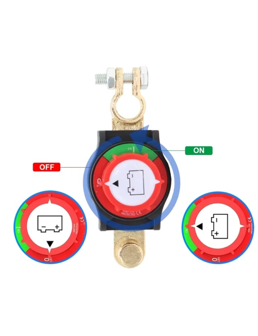 Вимикач маси (відсікач живлення) використовується як аварійний вимикач живлення акумулятора в авто, на катерах, мото, лебідках та інших. Поворотом кнопки дозволяє відключити електричніі прилади, бортову мережу від акумулятора.