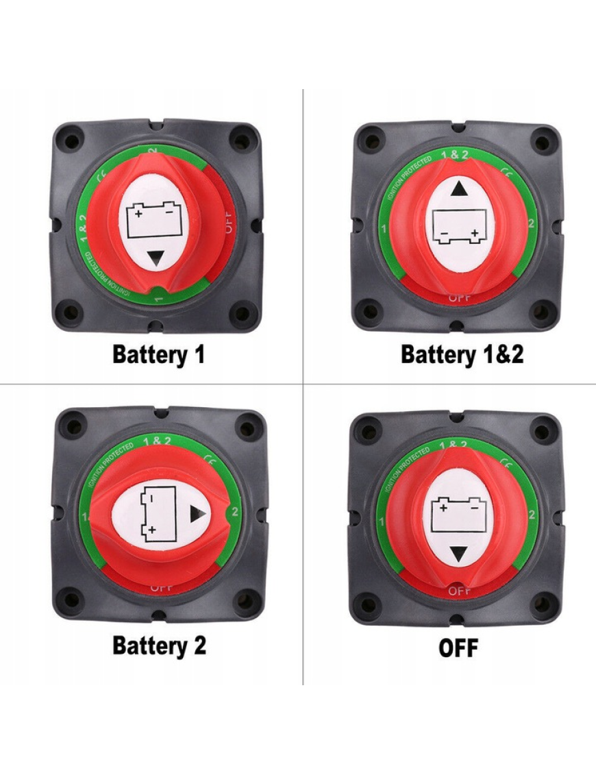 На ручці 4 положення перемикача: вимкнути, включений акумулятор №1, вкл. батарею №2, включений акумулятор № 1 та № 2.
